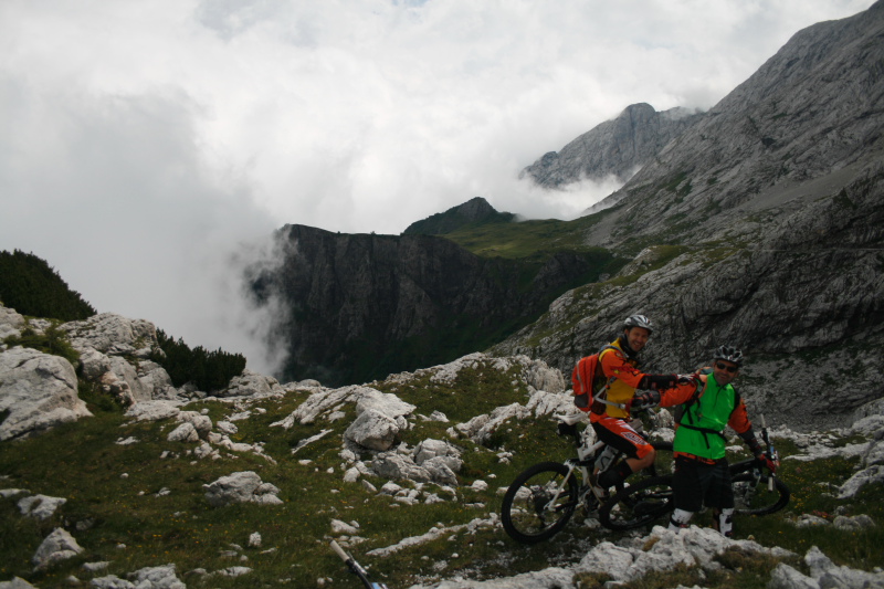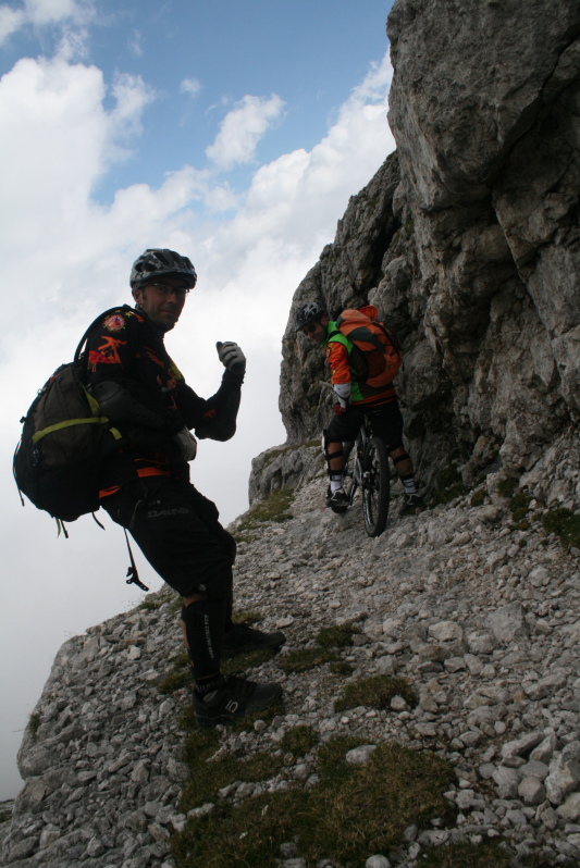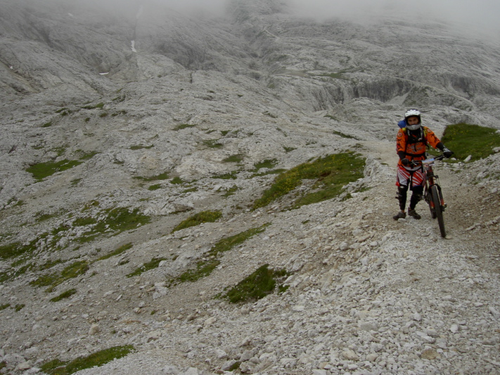 Dopo un po’di forestale e qualche km di asfalto arriviamo finalmente al passo Valles, dove ci aspetta un tratto in modalità BdB, con un bel pezzettino a spinta e a spallare la bici, che ci porta su a forcella Venegia, al cospetto delle Pale...foto di rito e ci avventuriamo giù nel laborioso sentiero che porta alla sterrata verso Baita Segantini.