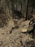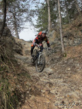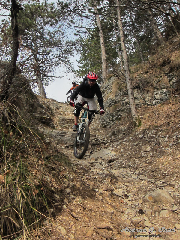 Tra un cuccio e una spinta arriviamo su, saliamo ai ripetitori della pineta ma perdiamo contatto col peloton e ci infiliamo giù per un canalone tutto pietroso, ripido e incazzato... colgo l'occasione intanto di ingolosire Mauro e gli faccio provare la Strive...si sa mai gli scappi un acquisto...